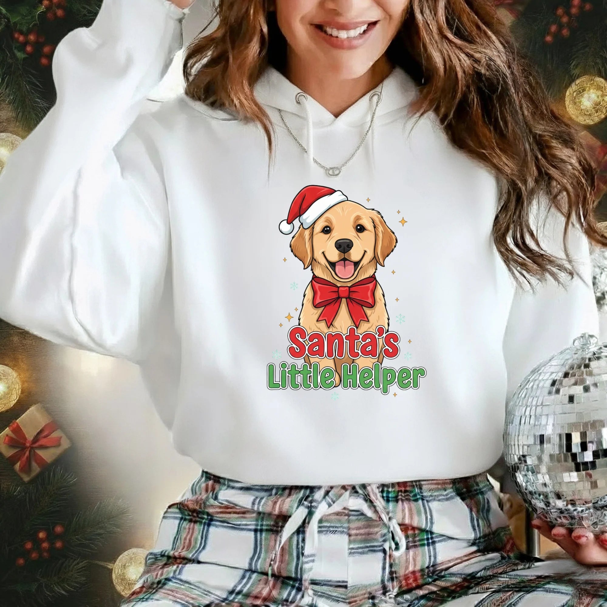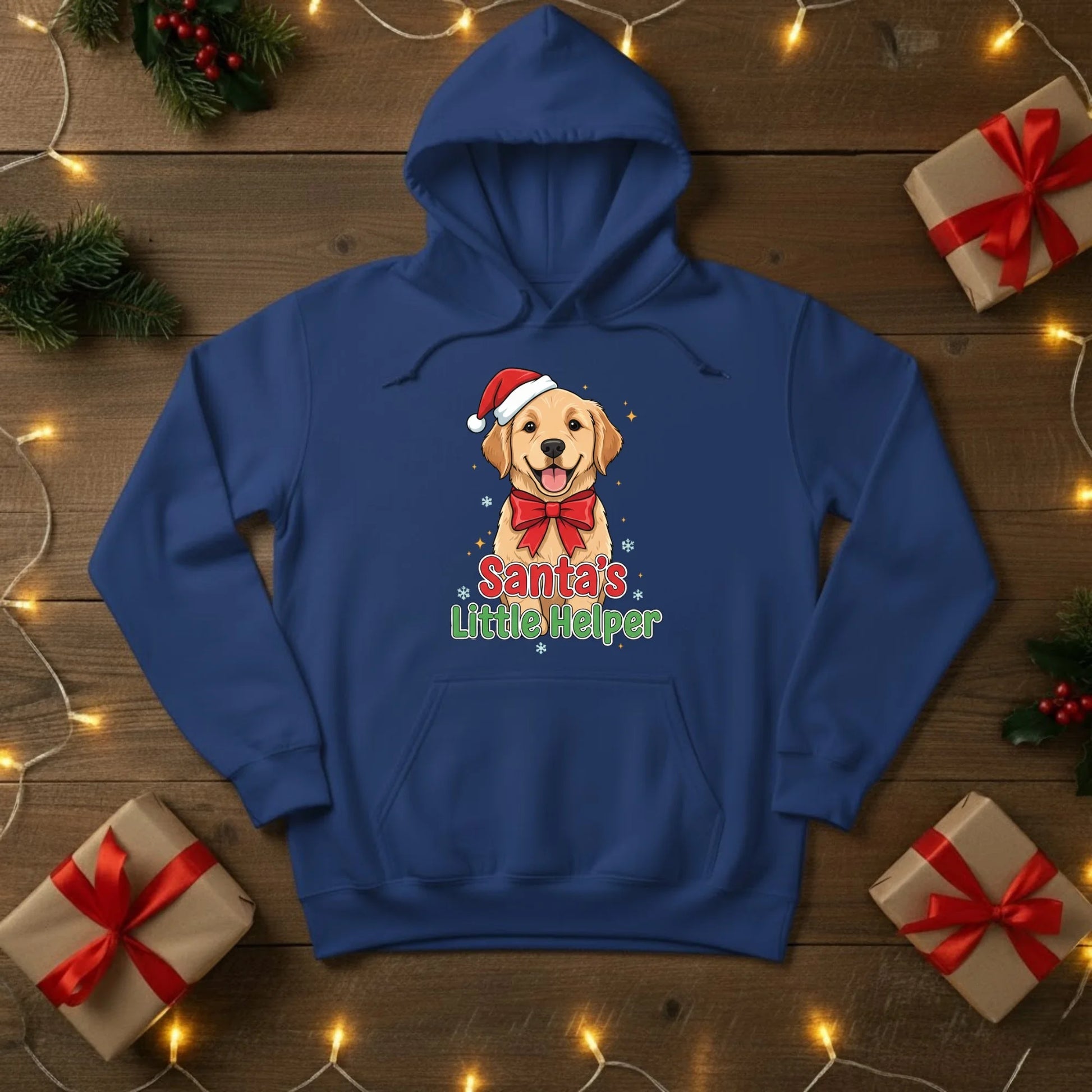 Spread some festive cheer with our Santa’s Little Helper Christmas Hoodie — the perfect pick for dog lovers and holiday enthusiasts alike! Featuring an adorable pup in a Santa hat and bow, this cosy hoodie brings a playful touch to your winter wardrobe. Ideal for Christmas parties, gift exchanges, or simply lounging with a cup of hot chocolate by the fire.