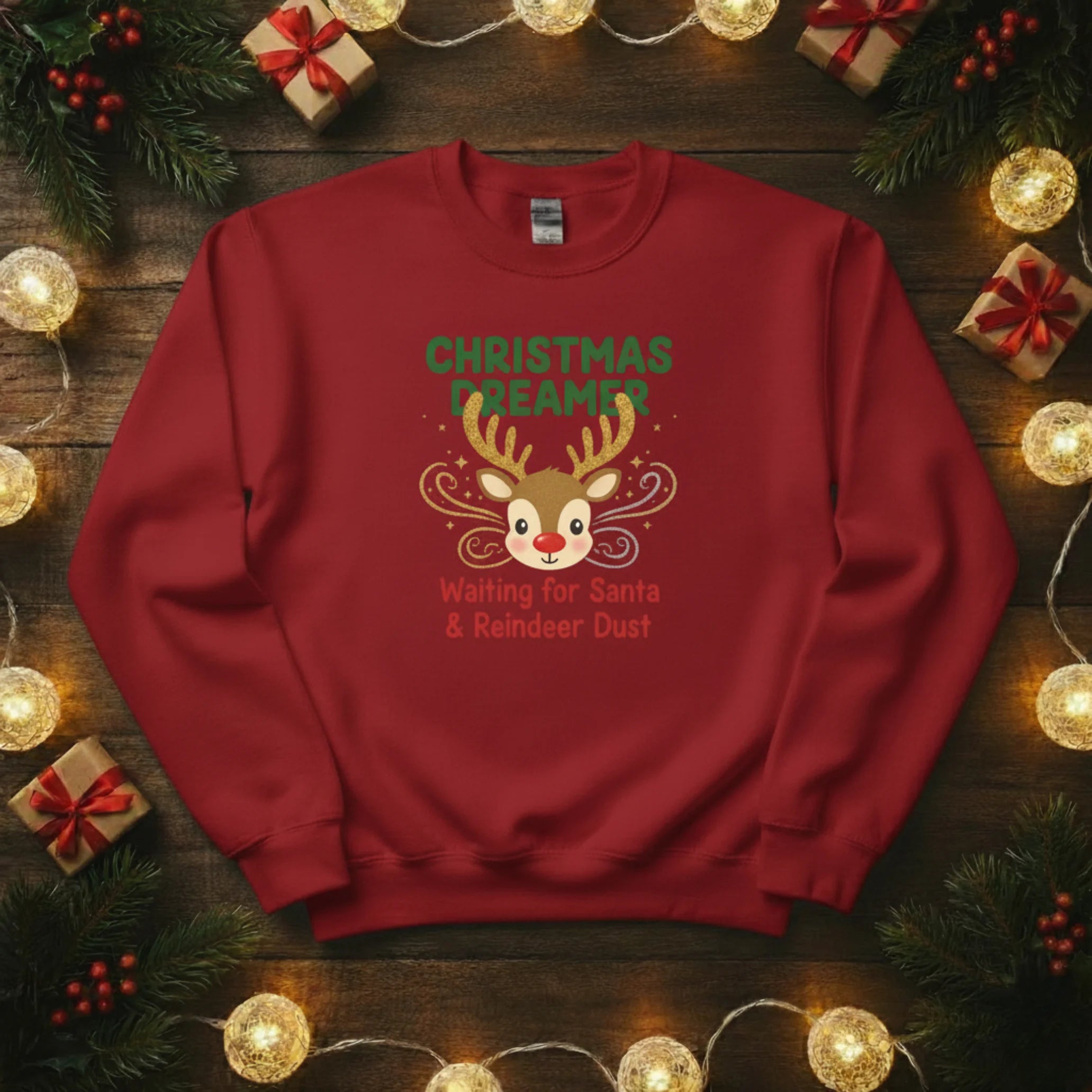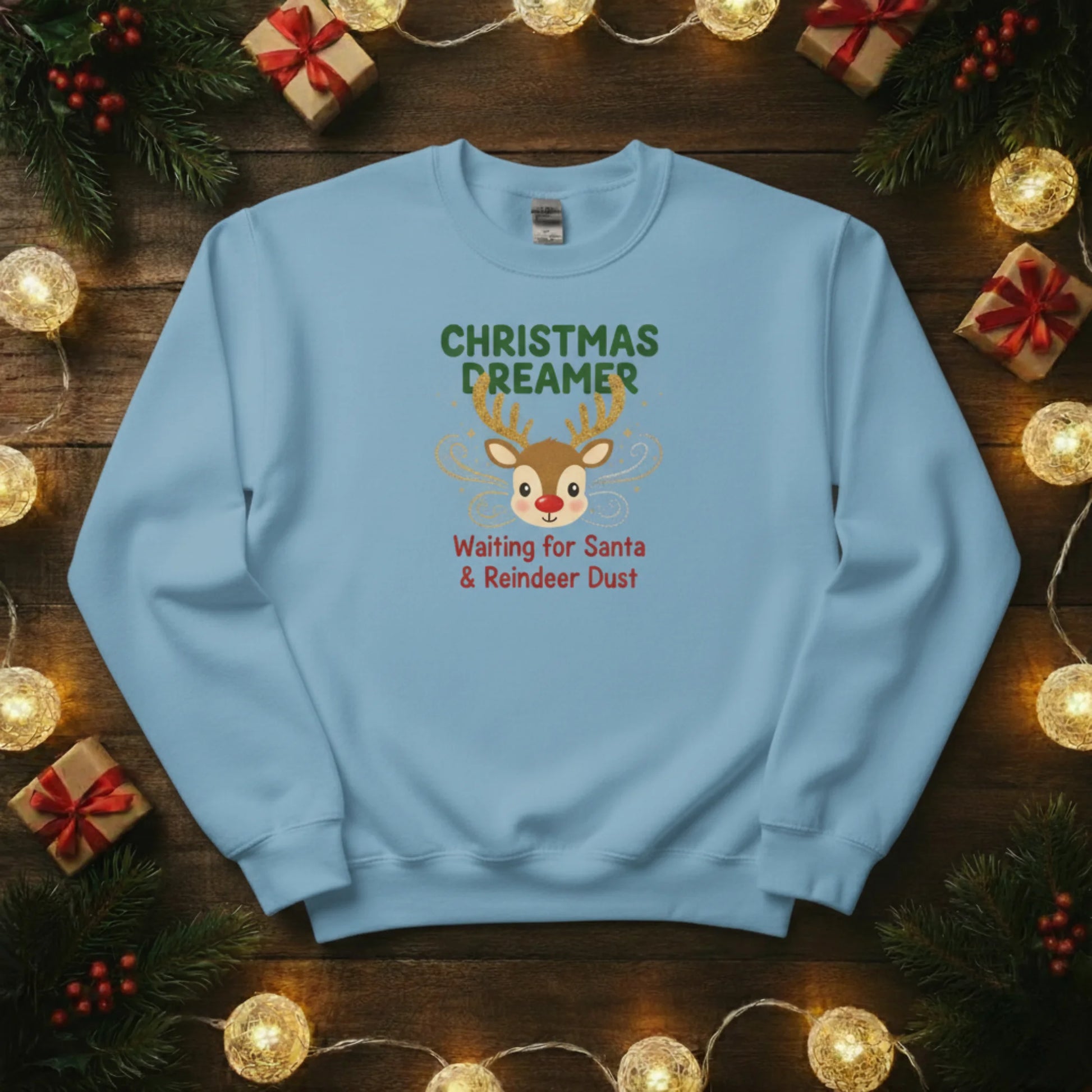 Bring a touch of festive magic to your winter wardrobe with our Christmas Dreamer sweatshirt! Featuring an adorable reindeer and the charming slogan Waiting for Santa & Reindeer Dust, this cosy jumper is perfect for those who never stop believing in the magic of Christmas. Whether you’re sipping hot chocolate, wrapping gifts, or waiting up for Santa, this sweatshirt captures the warmth and wonder of the season beautifully.