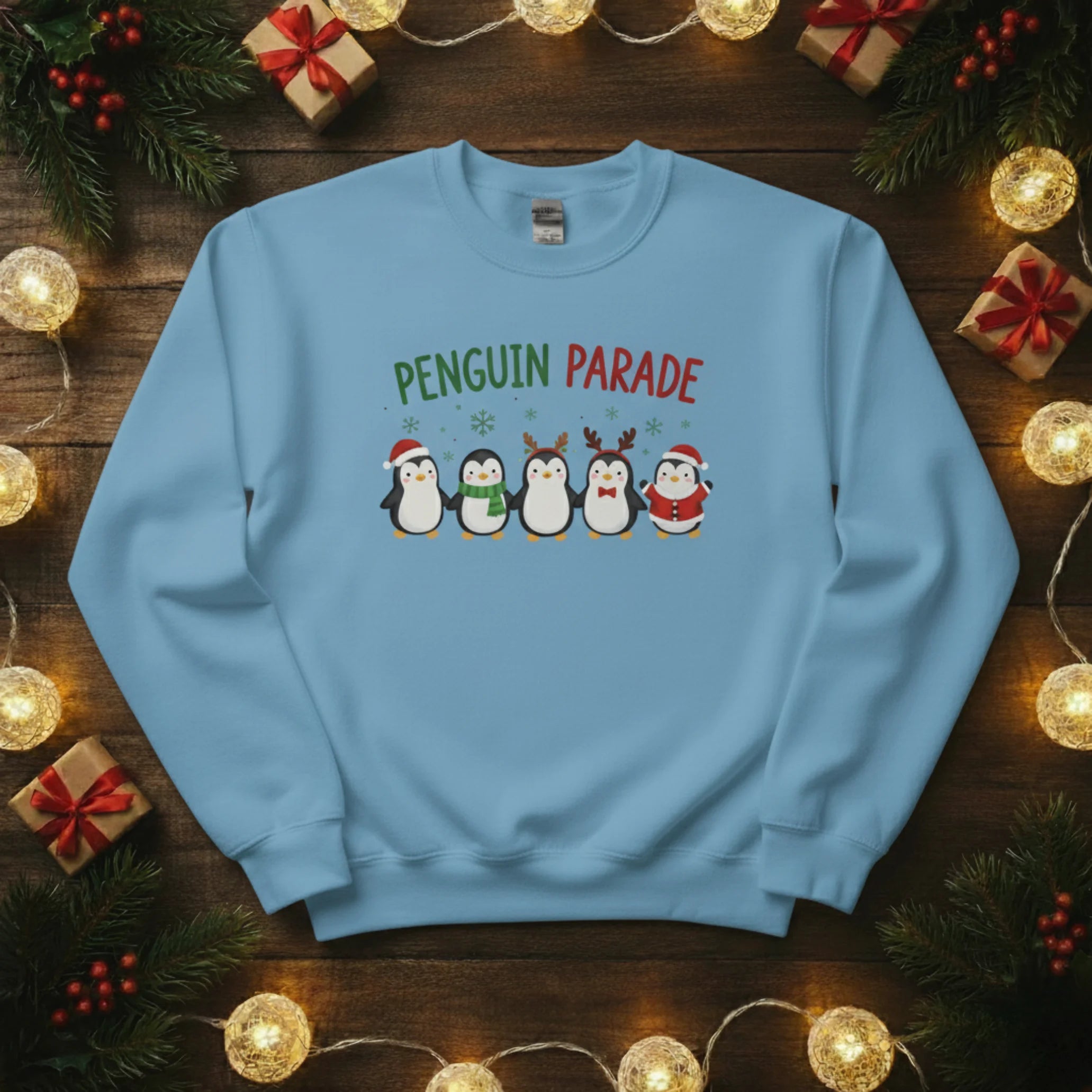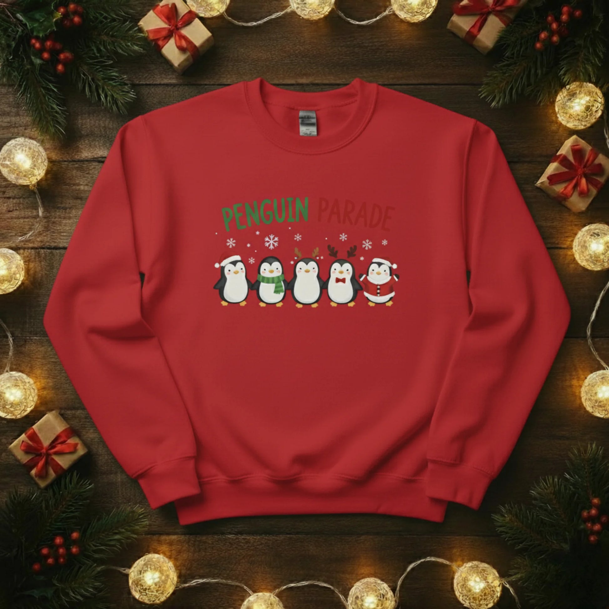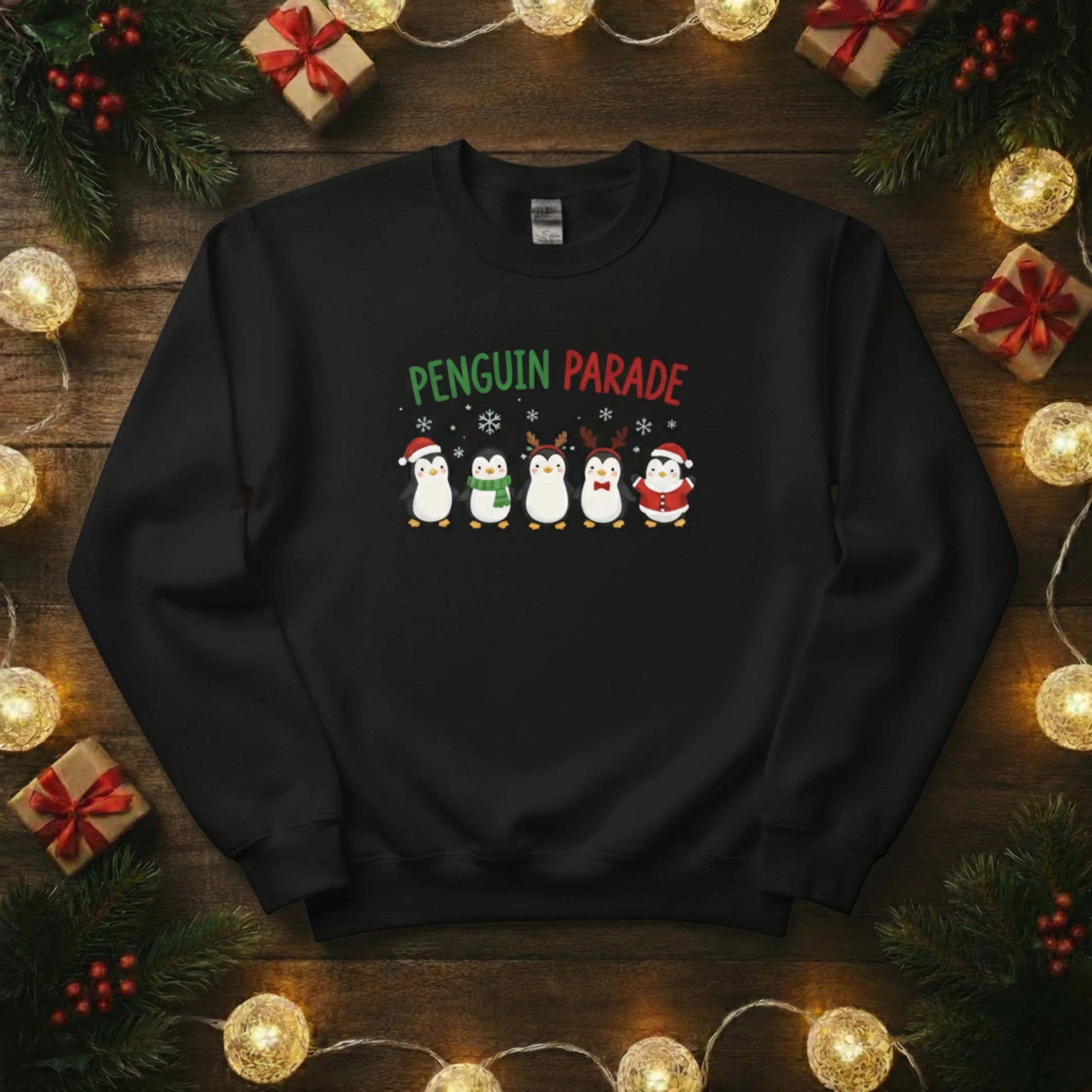 Bring some frosty fun to your festive wardrobe with our Penguin Parade Christmas Sweatshirt! Featuring a line-up of adorable penguins dressed for the season, it’s a joyful design that spreads instant holiday cheer.