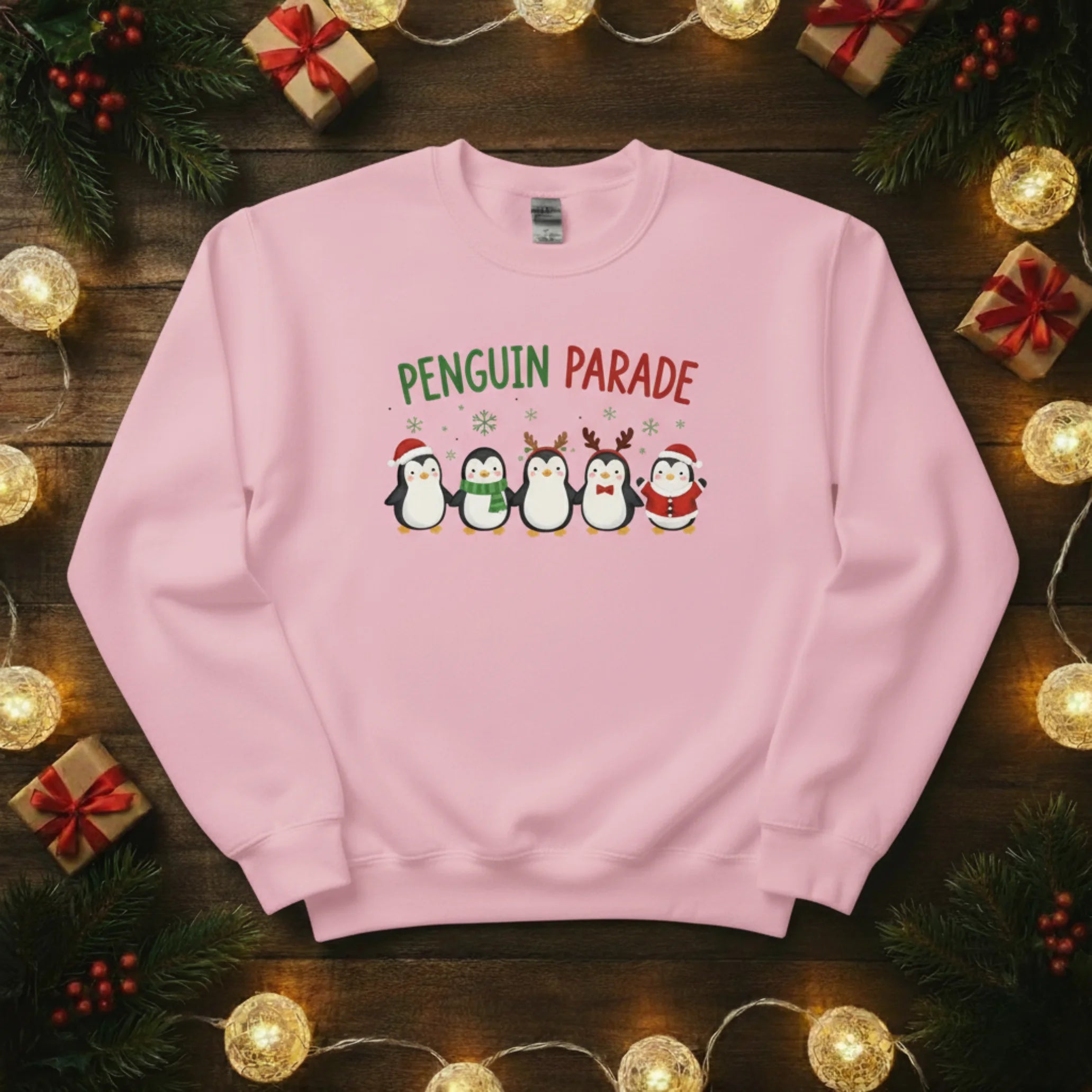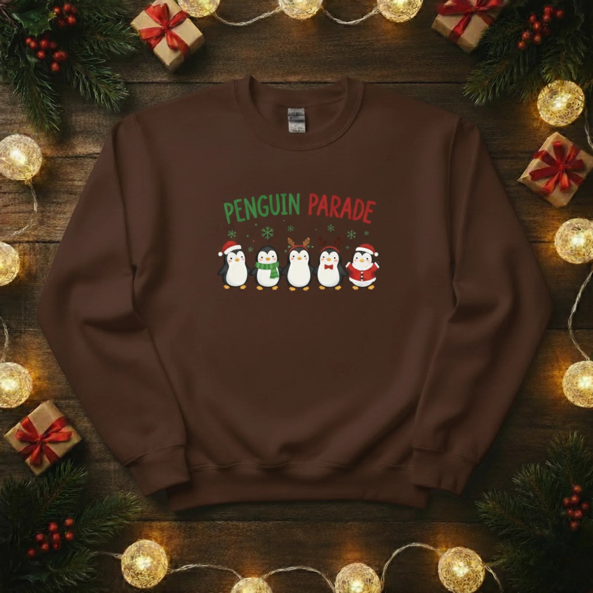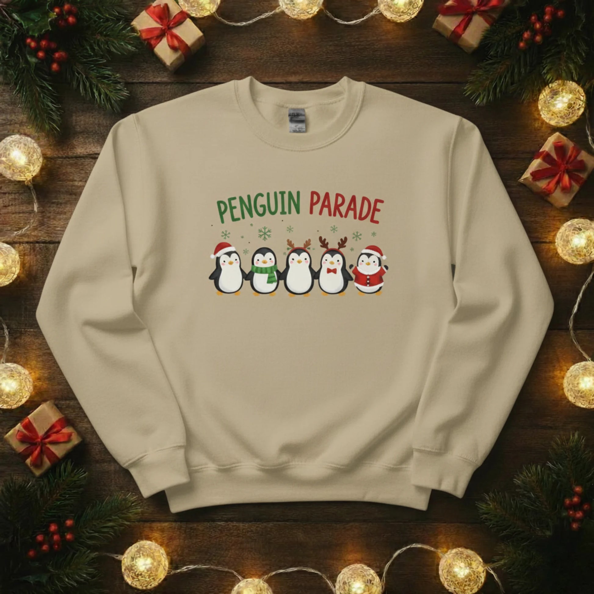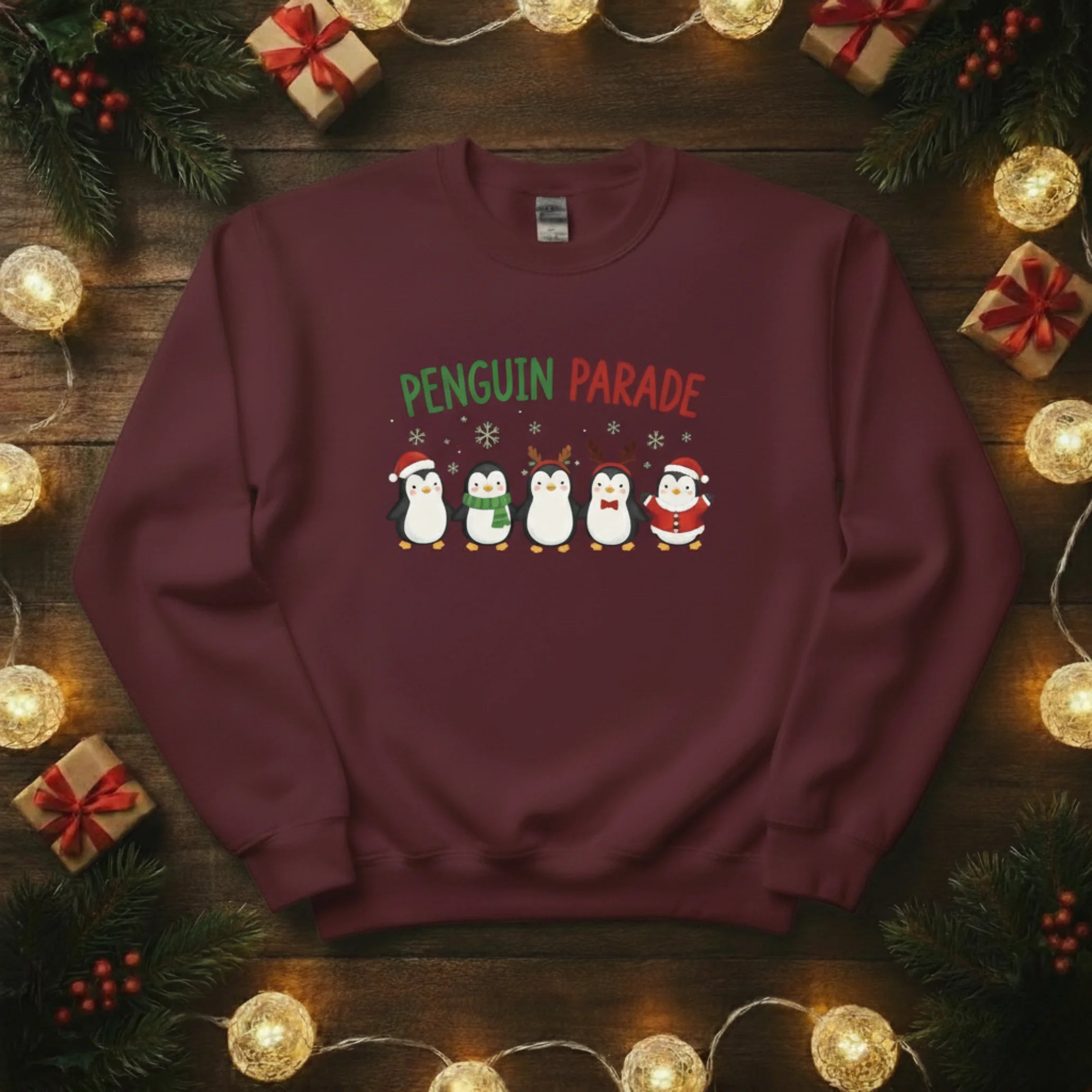Bring some frosty fun to your festive wardrobe with our Penguin Parade Christmas Sweatshirt! Featuring a line-up of adorable penguins dressed for the season, it’s a joyful design that spreads instant holiday cheer.